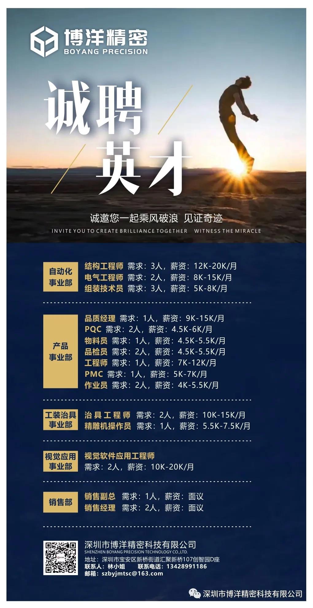 博洋精密科技 诚心引才、精心育才 优美办公环境、完善的人才福利 配套图书馆、羽毛球馆、足球场 五险一金、带薪年假、年终奖金 公司团建、学习培训、生日礼品、公司下午茶等... 我是博洋精密总经理汤绍成,感谢此时正在看招聘信息的你,我代表博洋公司诚挚邀请你加入,成为博洋人,共同担当“为国家制造产业升级战略”的责任。 在2020年公司已完成以五金结构件产品+高端智能装备的全产业链布局和规划,自动化、机器人、视觉应用、工装夹治具、五金结构件产品等八个事业部,一定有合适你的职位,希望能与优秀的你携手同行,共谋发展。