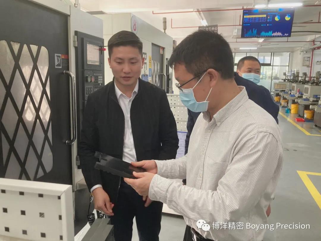 博洋精密总经理汤绍成介绍了自动化事业部主要服务领域为手机、笔电等行业及主要聚焦的客户群体,并带领书记参观工装夹治具事业部和精密加工事业部。