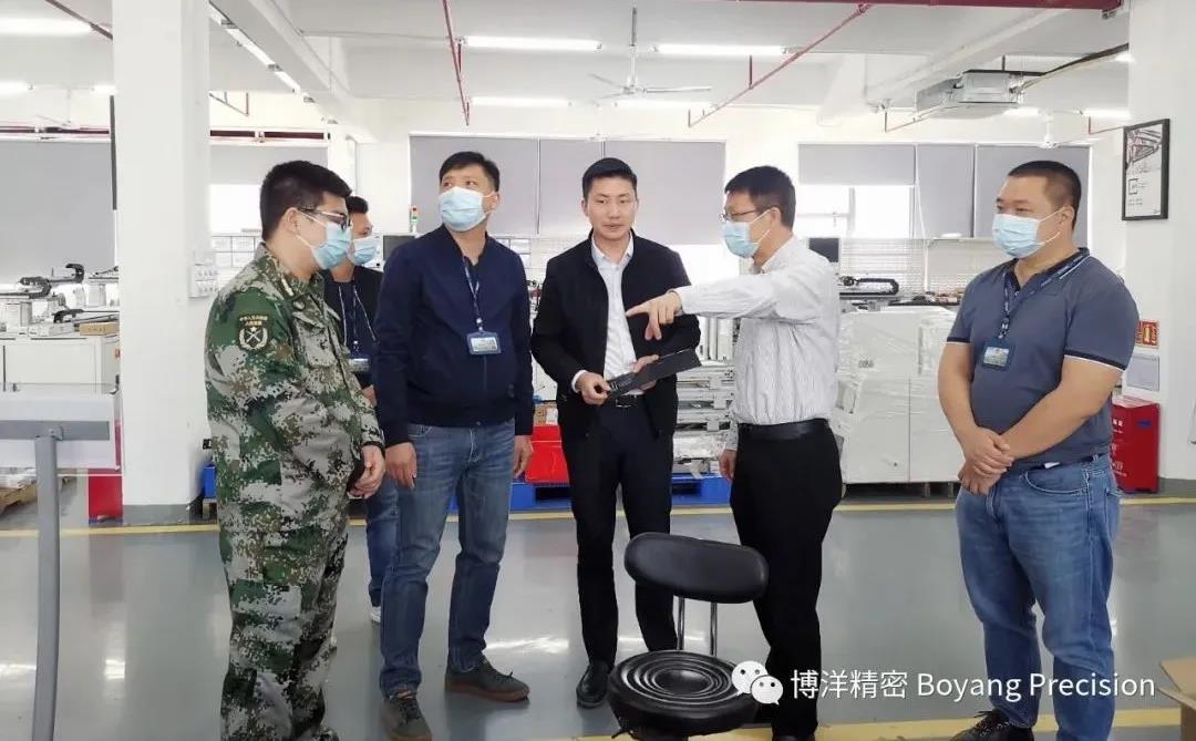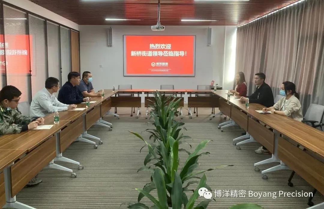 11月10日下午,新桥街道党工委副书记、人大工委主任熊俊峰、上寮社区党委书记曾志允等一行莅临博洋精密科技。现场,博洋精密总经理汤绍成接待并介绍了博洋精密科技目前的发展和今年已是国高企业,俊峰书记现场的一句“博洋精密发展,非常鼓舞”,对博洋精密高度评价和鼓励创新,并表示会大力支持和助推博洋精密的快速发展。